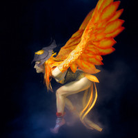 large wings and tail feathers that resemble flames, along with a mask and armor to complete the character's look.