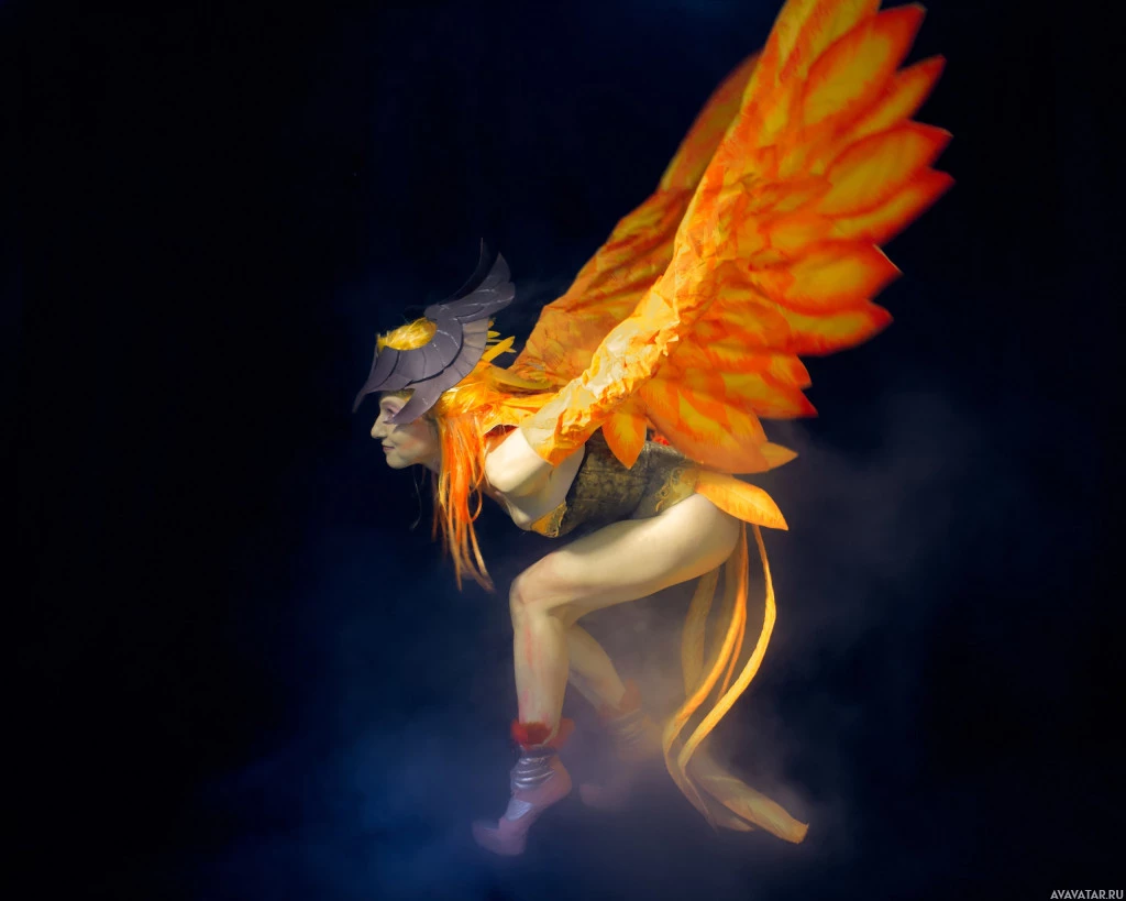 the video game Dota 2. The costume is detailed, featuring an orange and black bird-like appearance with