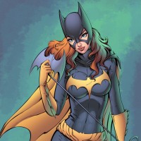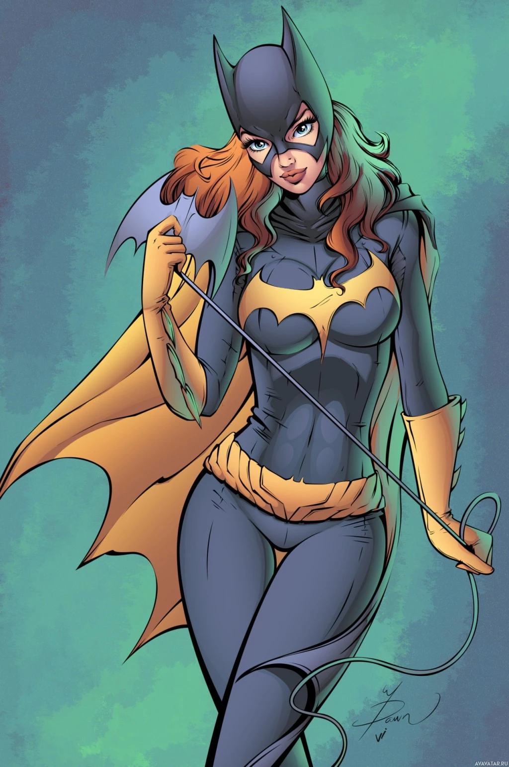 iconic costume which includes a black bat-themed outfit with yellow accents and a cowl, along with a utility belt. In this particular illustration, she's also holding what appears to be a cat. The artwork captures