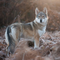dry leaves or grass, which is characteristic of woodland habitats where wolves might live. The lighting suggests it could be