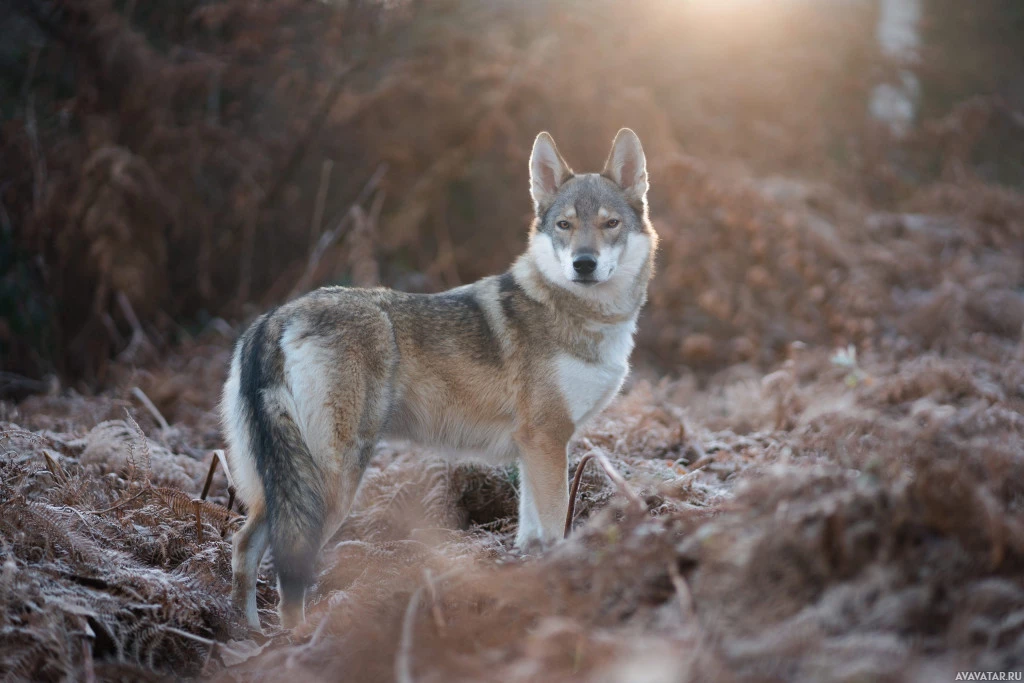 The image features a wolf-like dog with a coat that resembles