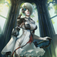 pointed arches and light filtering through trees, creating a contrast between the character's futuristic appearance and the traditional, possibly cathedral-like setting.