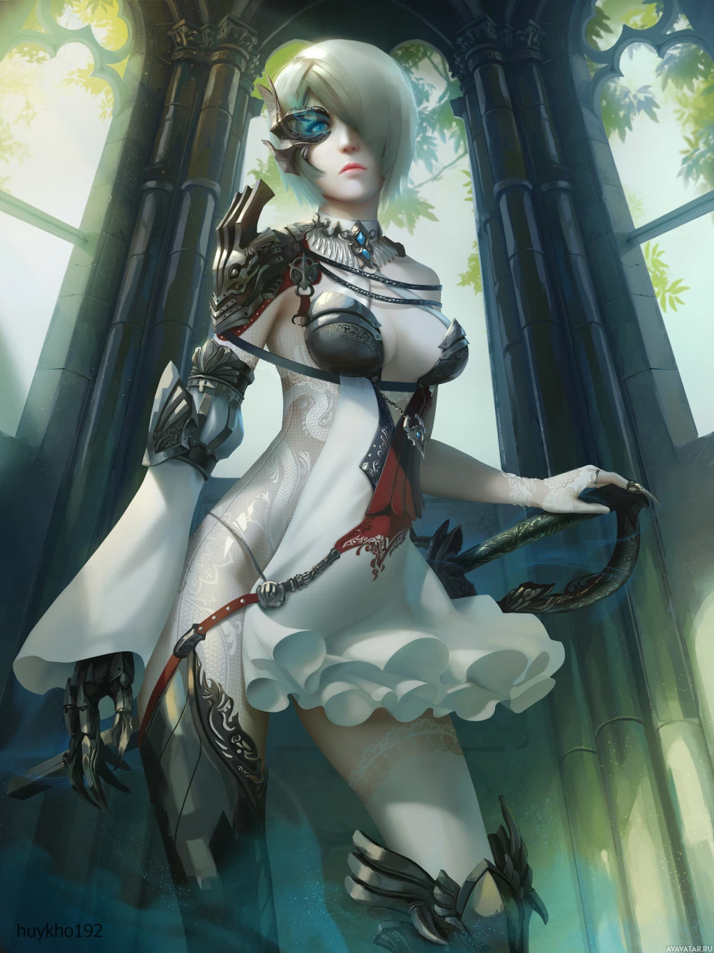 armor pieces and a detailed skirt with frills and embellishments. The background features a gothic architectural style with