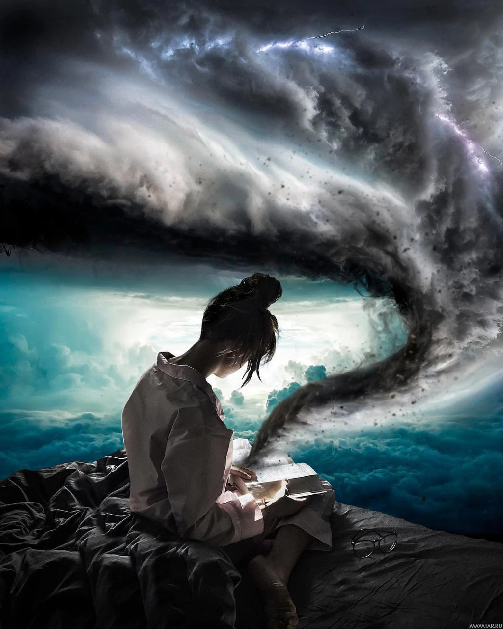 the power of literature to transport one into another world or to provide escape from reality, even in the face of tumultuous circumstances. The image is highly stylized with a dramatic color palette and