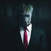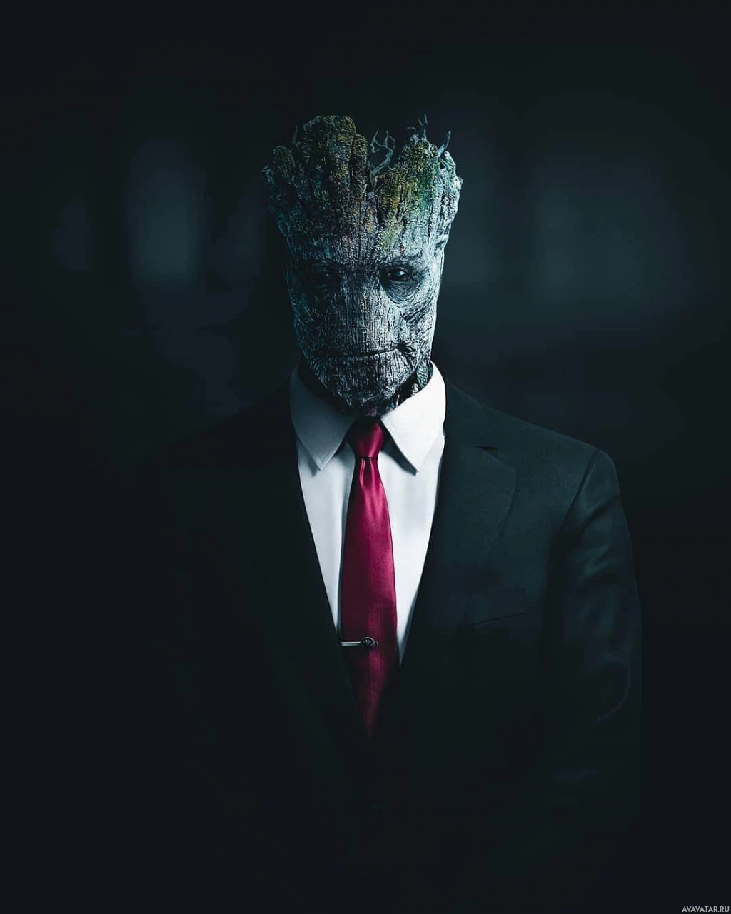 green suit and a red tie, with a distinctly altered face that resembles Groot from the Marvel movies. The character's appearance is monstrous, featuring a mouth full of sharp teeth,