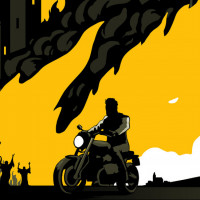 The image depicts a silhouette of a person on a motorcycle. There is fire surrounding the figure, suggesting a chaotic or dangerous situation. This could be an illustration related to themes such as conflict, danger, or heroism.