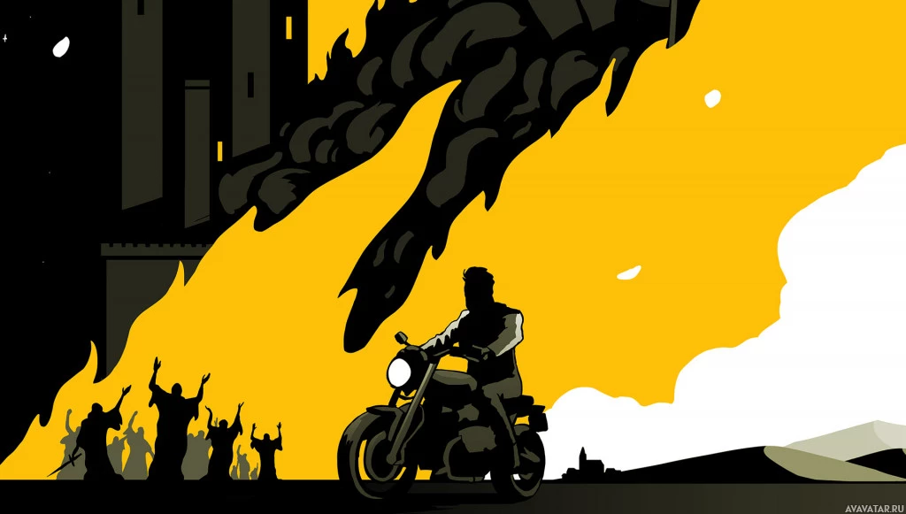 На картинке изображен силуэт человека на мотоцикле. Огонь окружает фигуру, предполагая хаотичную или опасную ситуацию. Это может быть иллюстрация, связанная с такими темами, как конфликт, опасность или героизм.