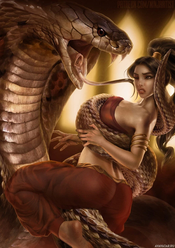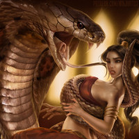 brown hair, is wearing what looks like a traditional outfit that could suggest a historical or mythological setting, and there's a halo of light around her, indicating she might be a significant figure or perhaps the subject of a story. The snake wraps its body around her in an intimate manner. The setting is richly detailed with textures that evoke