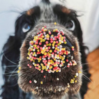 candy sprinkles on the dog's nose, which indicates that this was likely done for fun or as part of a creative photo opportunity.