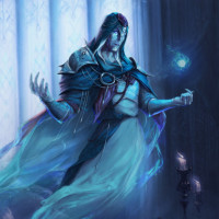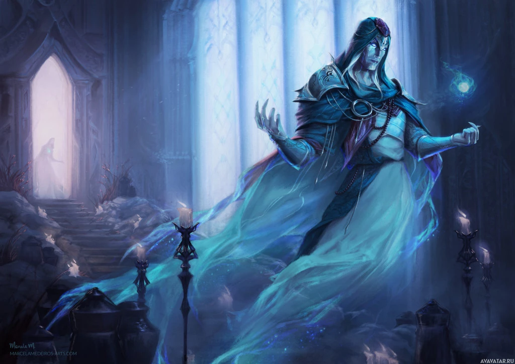 a dark room filled with candlelight, suggesting a mystical or magical environment. The character appears to be looking upwards and towards the viewer, which could indicate they are focusing their energy or magic on something beyond the frame of the image. The overall mood is one of mystery and enchantment, typical of fantasy artwork meant to evoke