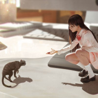 a school uniform with a tie. She is crouching down next to what seems to be