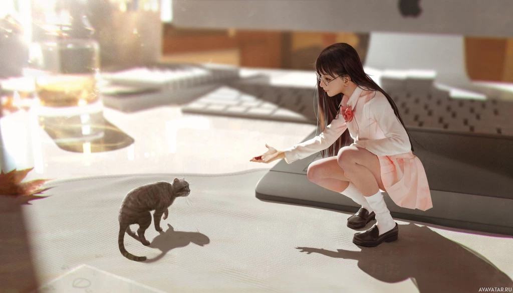 a cat on the ground. They are both indoors, in an area that looks like it could be a classroom or a study room, as suggested by the presence of a computer keyboard and what appears to be