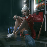 a red jacket and is accompanied by a large cat that seems to have been affected by the same situation as the girl, given its torn appearance. The setting suggests it could be post-apocalyptic or in