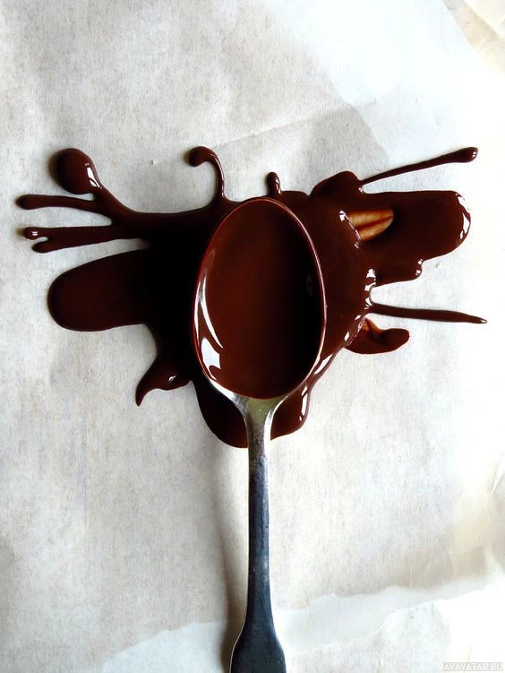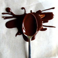 brown substance, which appears to be chocolate or possibly some kind of thick liquid. Some of the chocolate has been poured out onto a surface, creating an irregular, splatter-like pattern that resembles paint. There's no evidence in the image of actual paint, but rather it seems to be comparing the appearance of the substance with