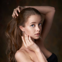 defined eyebrows and eyeshadow, along with what appears to be a subtle lip color. She has her hand on her head near her ear, possibly adjusting her hair or holding it back. The background is neutral-toned and does not distract from the subject.