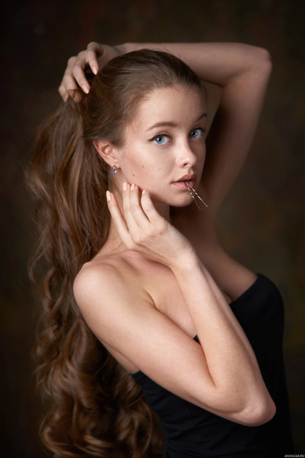 loose waves, with strands of hair cascading down over her shoulders. Her makeup includes