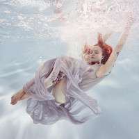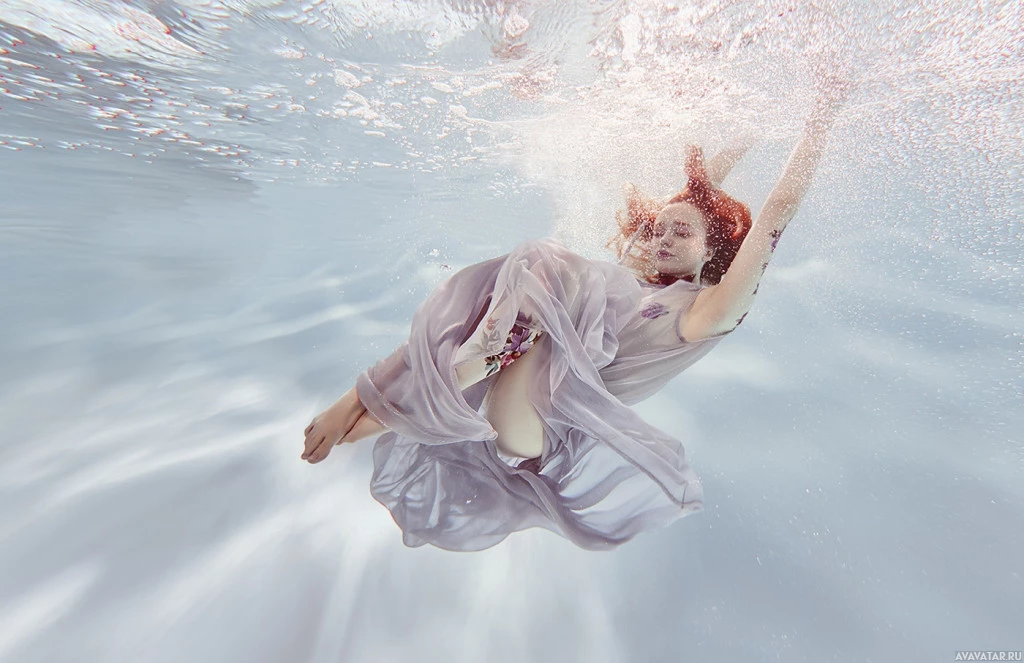red hair floating in clear water. They appear to be wearing a light-colored, flowing garment that might suggest movement or dancing underwater. The image is well-lit and captures the individual's form gracefully against the refractive