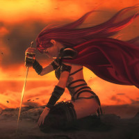 The image depicts a female character with red hair, wearing a cloak. She is holding what appears to be a sword or staff in her hand and is standing in front of a fiery sky. Her expression seems focused or determined as she gazes into the distance. The setting suggests a dramatic or adventurous scene, possibly from a fantasy story or video game.