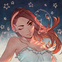 the night sky, which adds a whimsical or dreamy element to the scene. There is also an illustration of a cat on her arm, giving the impression that it is part of her playlist or
