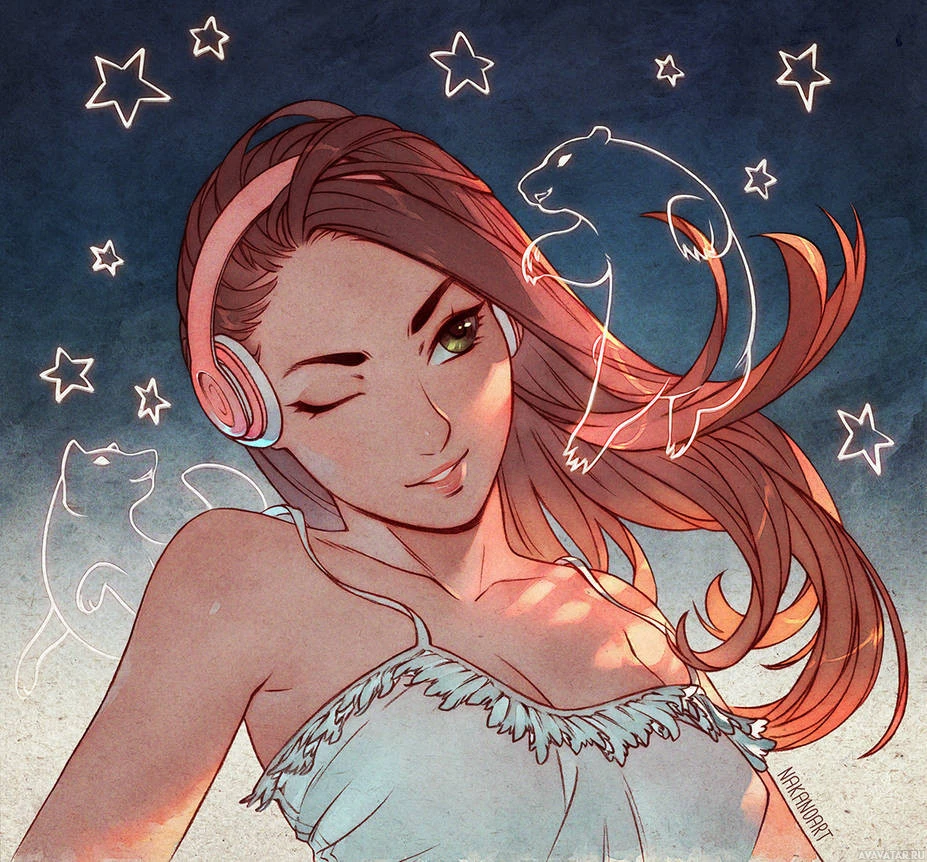 long hair, is looking upwards with her eyes closed, suggesting she is enjoying the melody or lyrics of the song. Behind her, there are stars in