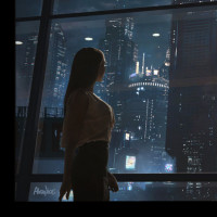 The image shows a stylized cityscape at night with high-rise buildings and neon lights. In the foreground, there is a person looking out of a large window, seemingly observing the city below. The scene has an atmospheric and futuristic feel to it.