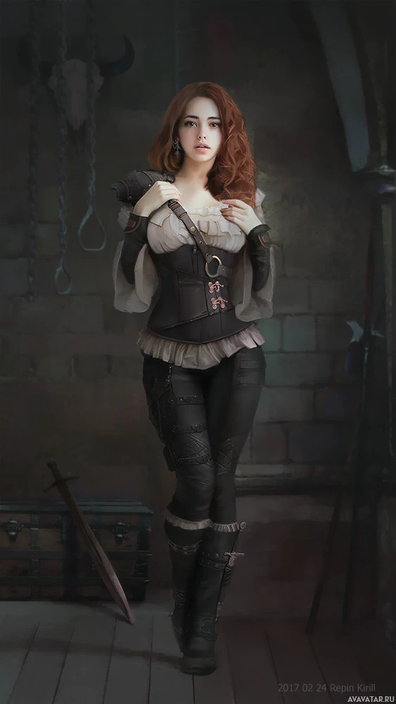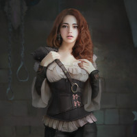 red hair styled in a way that resembles medieval or fantasy attire, often associated with characters such as assassins or adventurers from fictional settings. She is wearing a corset-style top with