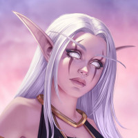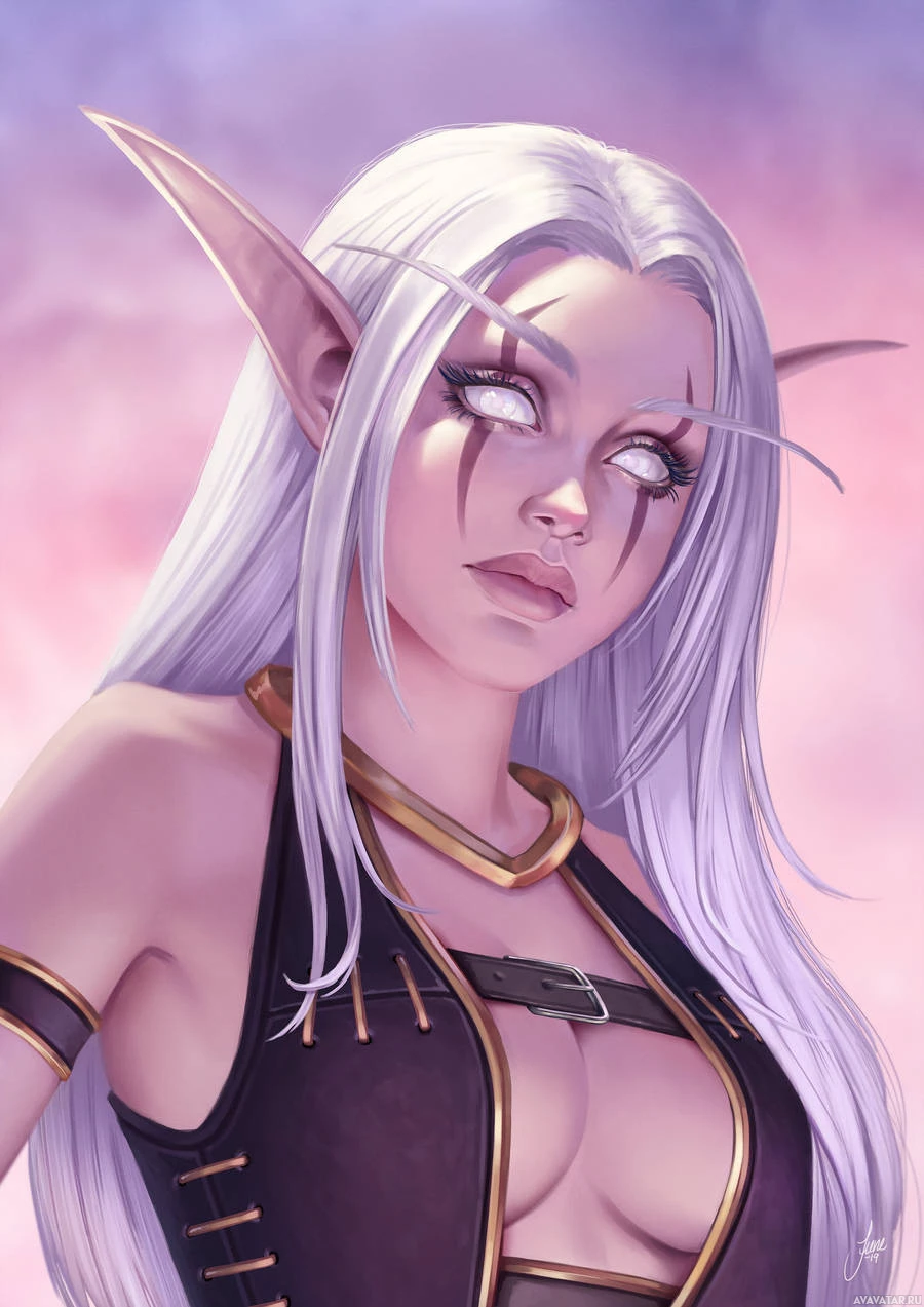 white hair and pointed ears, which are characteristic features of elves in many fantasy worlds. The character is wearing what appears to be armor or some kind of