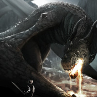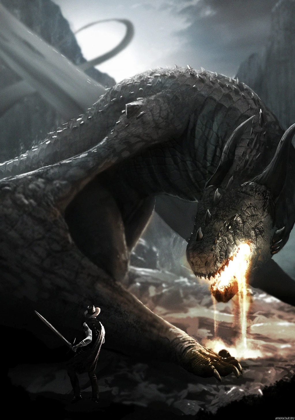 a desolate ambiance. There's an element of conflict or confrontation suggested by the stance of the figures, which could imply a narrative where the dragon is being challenged or battled by the smaller figure. The use of lighting and composition suggests that this is a digital