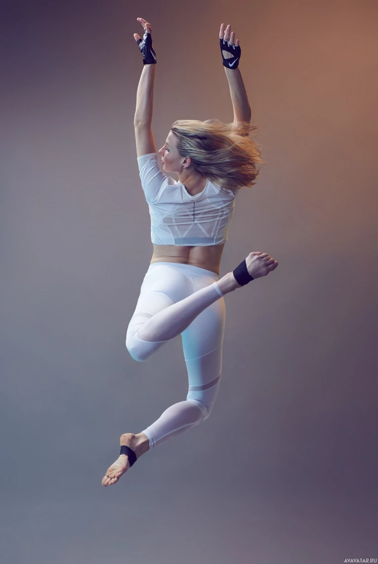 an athletic pose that resembles a leap or dance move. She appears to be wearing