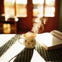 a cup of coffee with steam rising from it, placed on a table. There is also a book next to the cup, which appears to be open and facing upwards, suggesting someone may have been reading there recently. The setting seems to be indoors, possibly a home or a café, indicated by the sunlight coming in through a window with