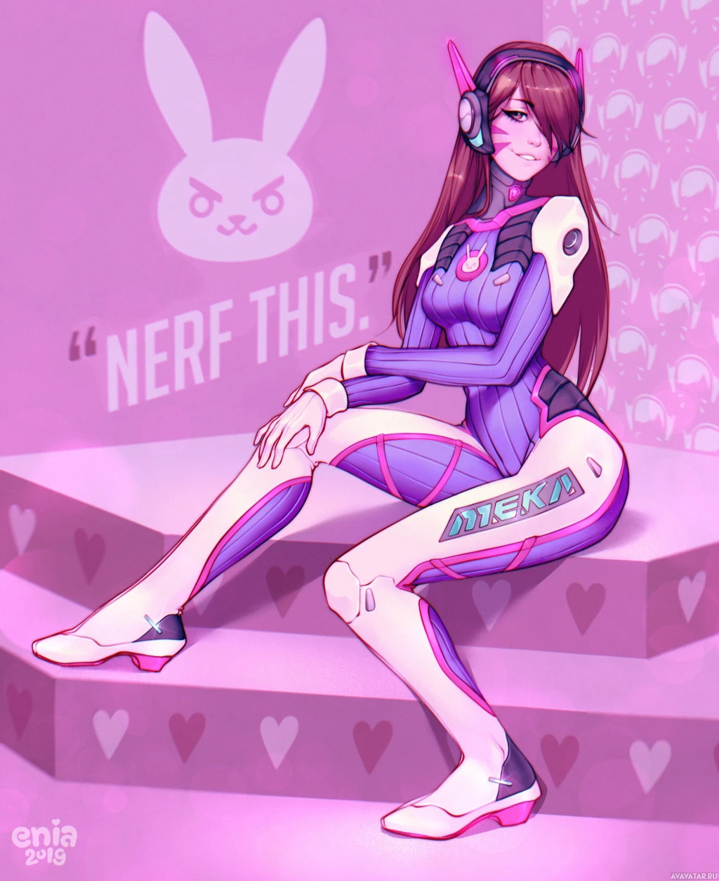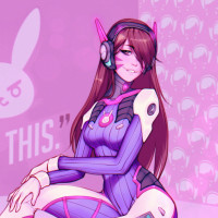 purple armor and sitting on a pink platform with a bunny symbol in the background. There are also heart symbols around her, indicating a theme related to love or romance, which is