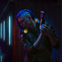 the video game Cyberpunk 2077. They are holding what appears to be a pistol, and they have a stylized haircut with a purple or blue tone, which is consistent with the character's appearance in the game. The background suggests a futuristic