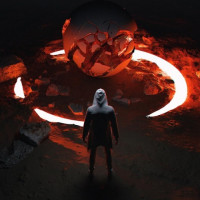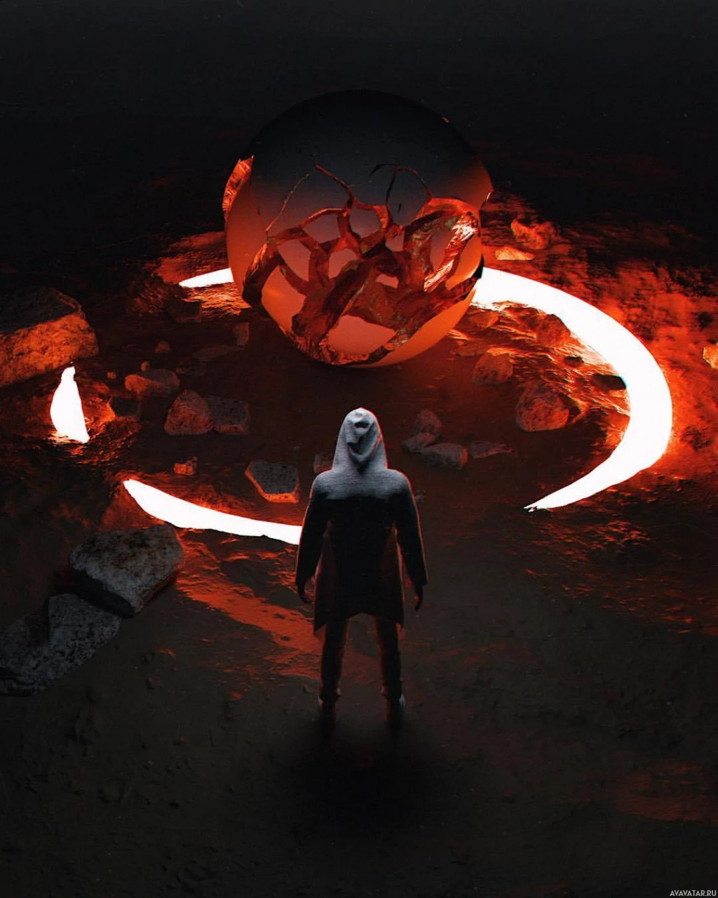 a hooded cloak and appears to be observing the surroundings. There's a large, cracked egg-like structure in front of the person, which seems to have been broken apart, suggesting it may have some significance to the scene. Surrounding this central figure are scattered rocks and debris, hinting at recent or ongoing