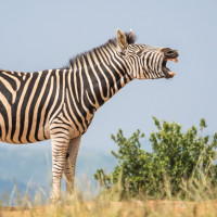 На картине изображена зебра в естественной обстановке. Животное, по-видимому, стоит на травянистой местности и либо восклицает, либо общается с другим животным, что можно вывести из его открытого рта и положения ушей.