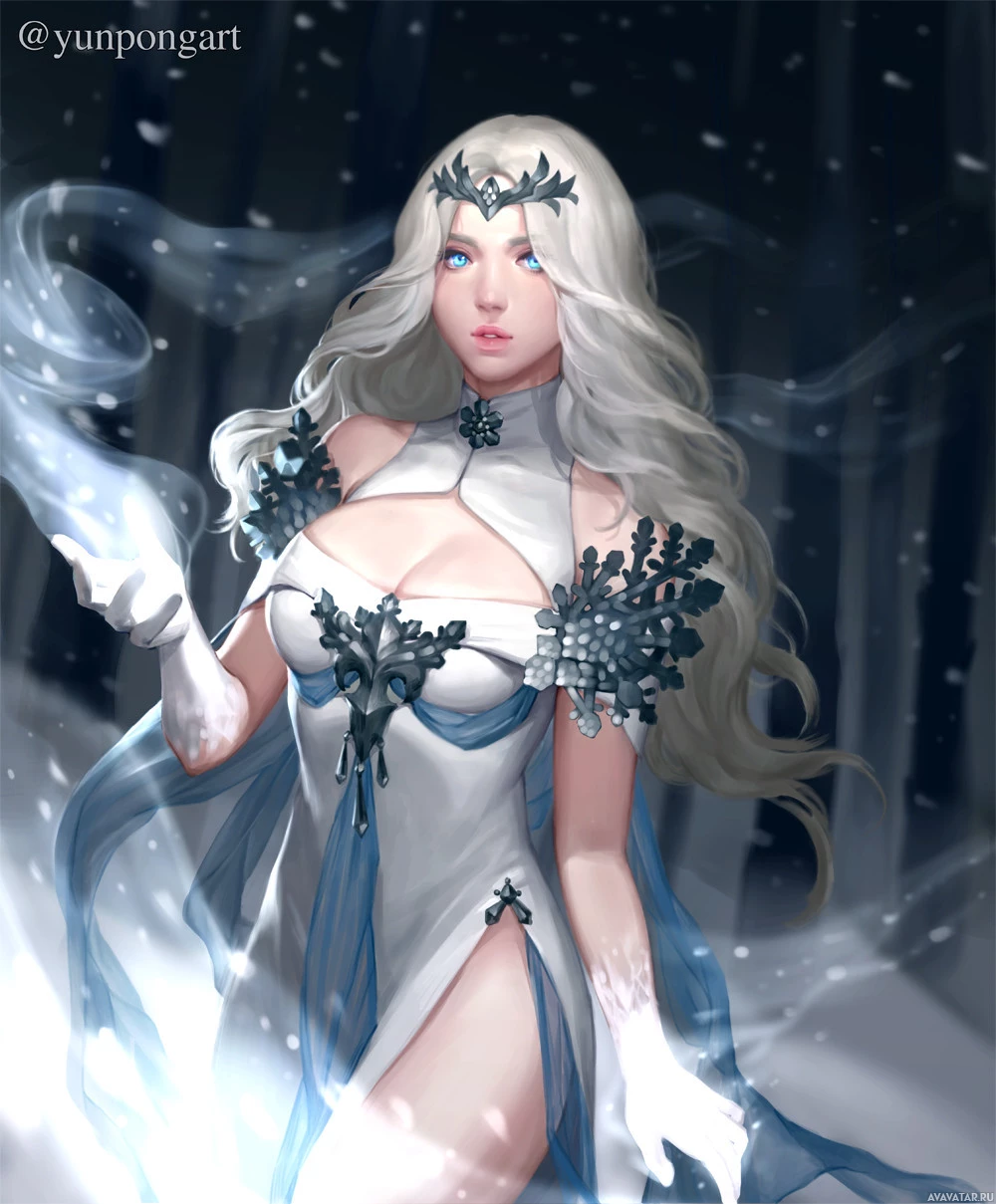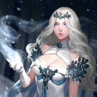 fantasy figure. She has long white hair and blue eyes, which gives her an ethereal appearance. She is wearing what appears to be an armor or outfit adorned with ice or snow motifs, suggesting a winter theme or perhaps a role related to cold environments in