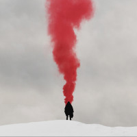 a single figure, likely a person, standing in an open landscape against a gray sky. The figure is emitting smoke or steam from their body into the air, creating a red wisp that contrasts with the otherwise