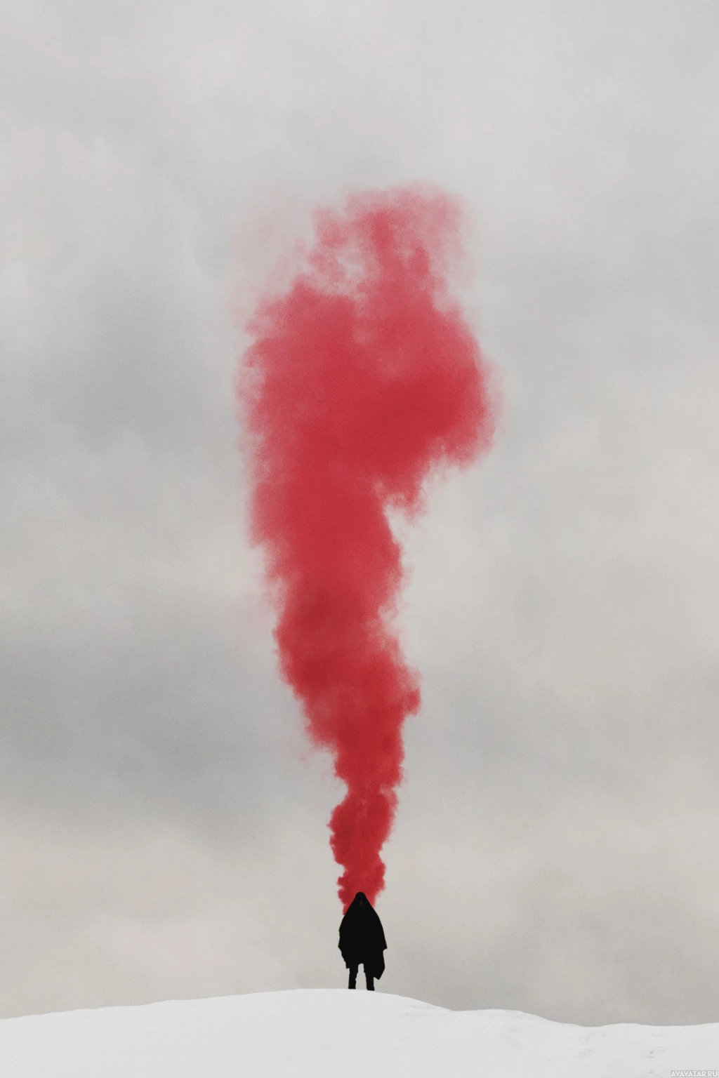 monochromatic scene. This could be interpreted as a form of expression or artistic representation rather than a literal event. The terrain appears flat and arid, possibly snow-covered ground, suggesting