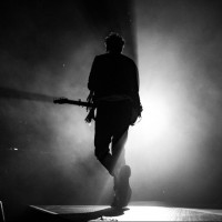 The image shows a silhouette of a person holding a guitar on stage, presumably during a music performance. The lighting creates a dramatic effect with the stage light illuminating the performer from behind, casting a shadow onto the front area where the audience would typically be seated. This type of image could be associated with a concert or live music event.