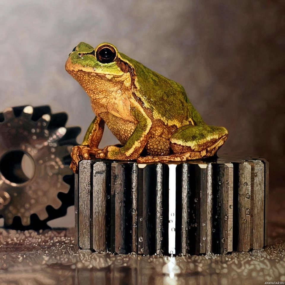 На картинке изображена лягушка, сидящая поверх того, что кажется металлическим объектом с шестернями, возможно, частью механизма. Фон нейтрально-тонированный и размытый, основное внимание уделяется лягушке.