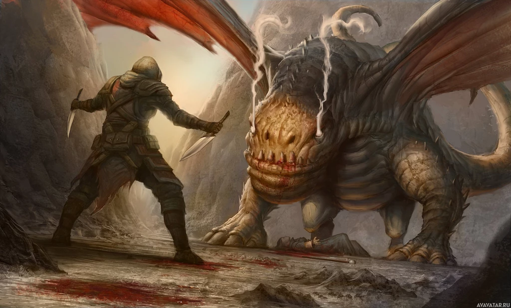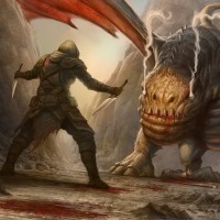 a fantasy scene with a warrior and a dragon. The warrior is standing in front of the dragon, which appears to be lying on its back, possibly defeated or unconscious. There are also