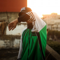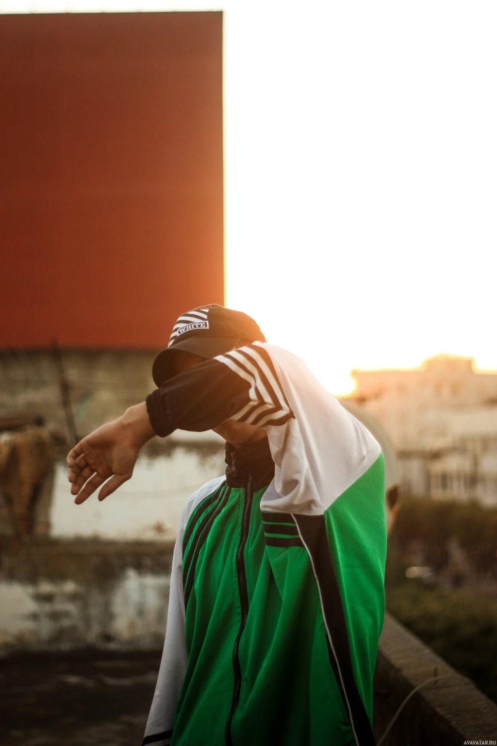 an urban background. The sun appears to be low in the sky, suggesting it might be either sunrise or sunset. The individual is wearing