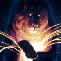 front paws resting on an orb of energy or light. The lion has a majestic and powerful presence, symbolized by its full mane and