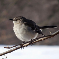 The image shows a small bird perched on what appears to be a branch or twig. It's a cold environment, as indicated by the frost and the barren trees in the background, which suggests it might be winter. The bird has white and grey plumage with some dark markings that could indicate species identification if needed.