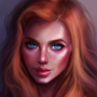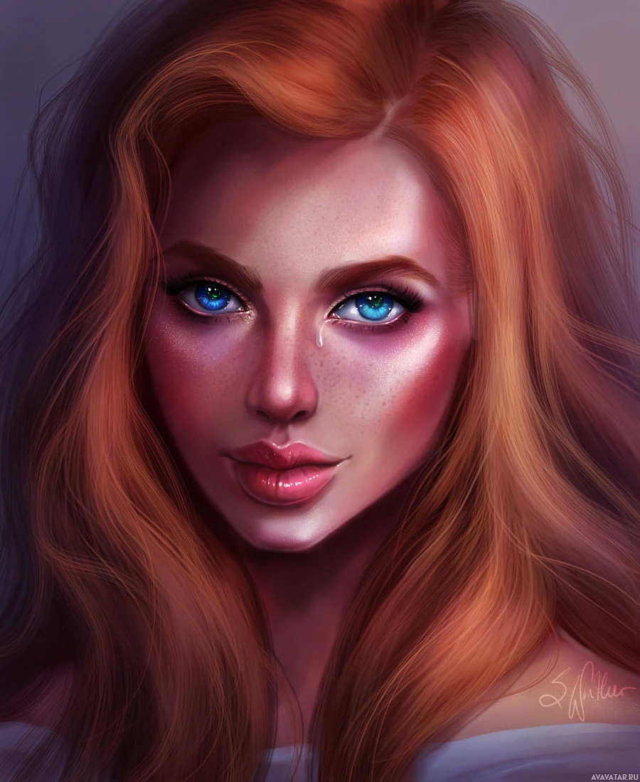 red hair, who has a gentle expression. She appears to have some makeup on, highlighting her eyes and lips with