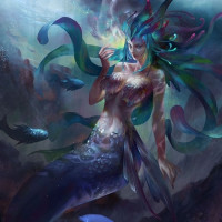 flowing hair with strands that resemble seaweed or coral. Her upper body appears human-like, and she is adorned in jewelry and garments that evoke a mystical or underwater theme. Her lower half transforms into the tail of a fish, colored in shades of blue, with scales and patterns suggestive of