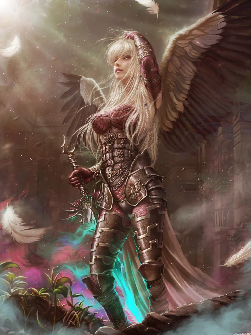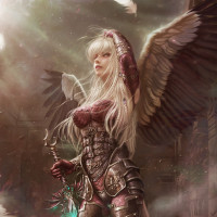 an angelic character. The character has wings and appears to be holding a sword, suggesting she might be some form of guardian or warrior. She is dressed in armor with a design that could suggest she belongs to a specific order or realm within