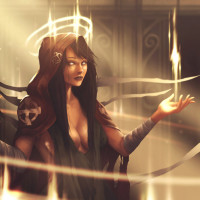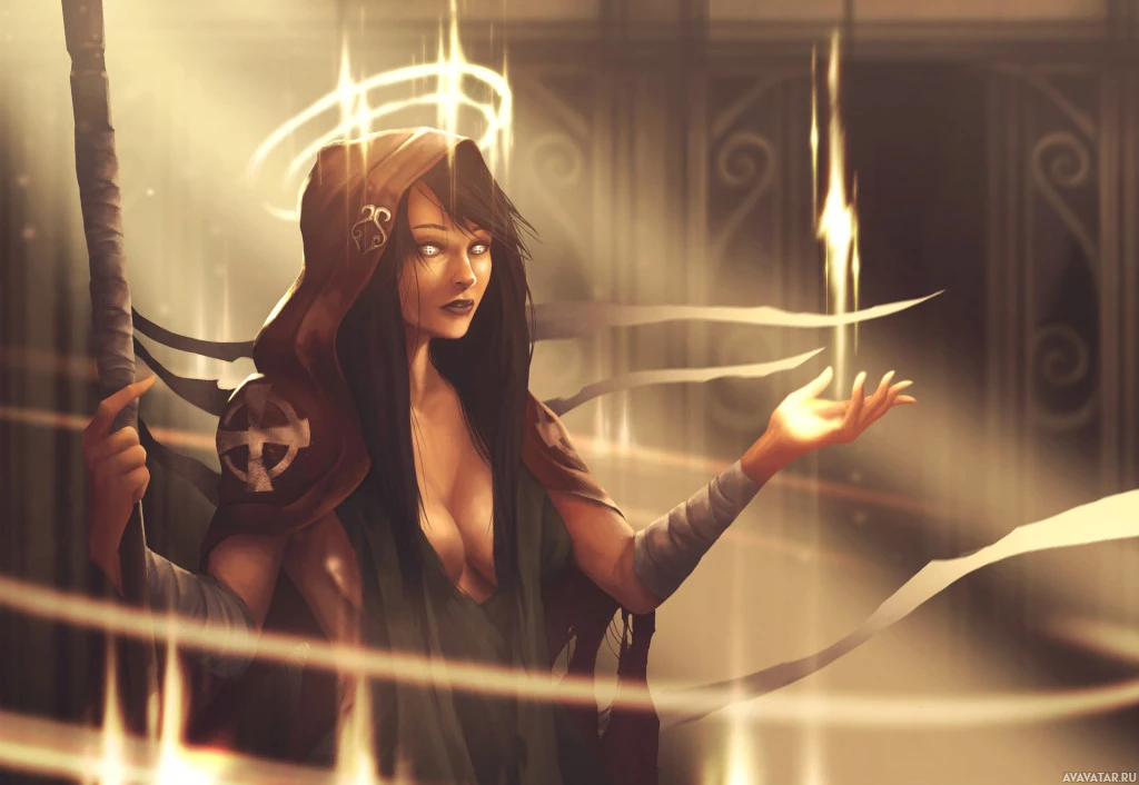 a female figure with long dark hair and is wearing a hooded robe with intricate designs on it. She appears to be casting some sort of