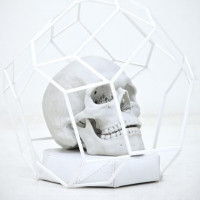 human skull with a complex geometric structure resembling a dodecahedron or some other form of polyhedral structure resting on top of it. This type of artwork often combines anatomical forms with mathematical concepts to create unique visual compositions. The background is neutral and does not distract from the central figure, which suggests that this image may have been taken for