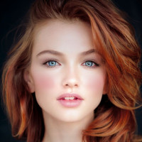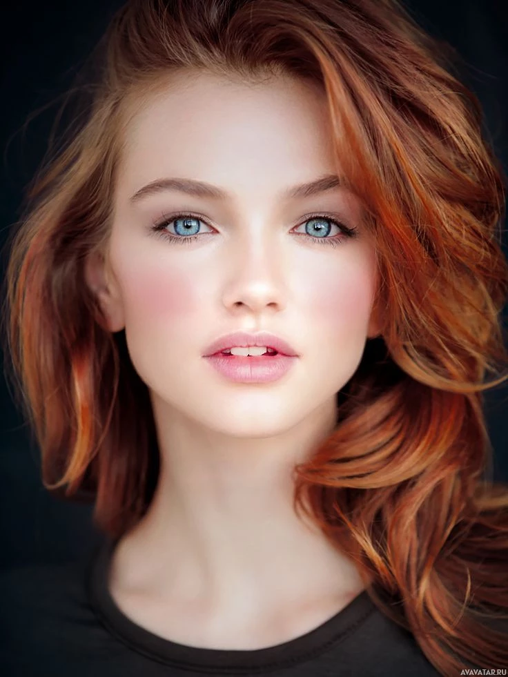 red hair and fair skin. Her gaze is directed towards the camera, and she has