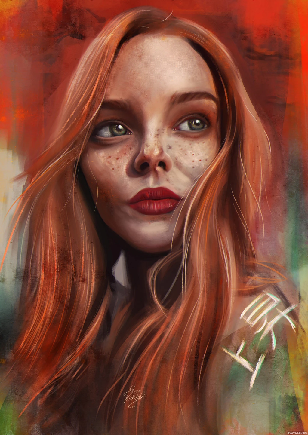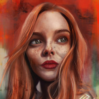 На картинке изображен стилизованный портрет молодой женщины с рыжими волосами. Ее взгляд направлен в сторону, и у нее есть созерцательное выражение. Художественное произведение включает абстрактные элементы, которые придают ему современный, возможно, цифровой или смешанный вид.